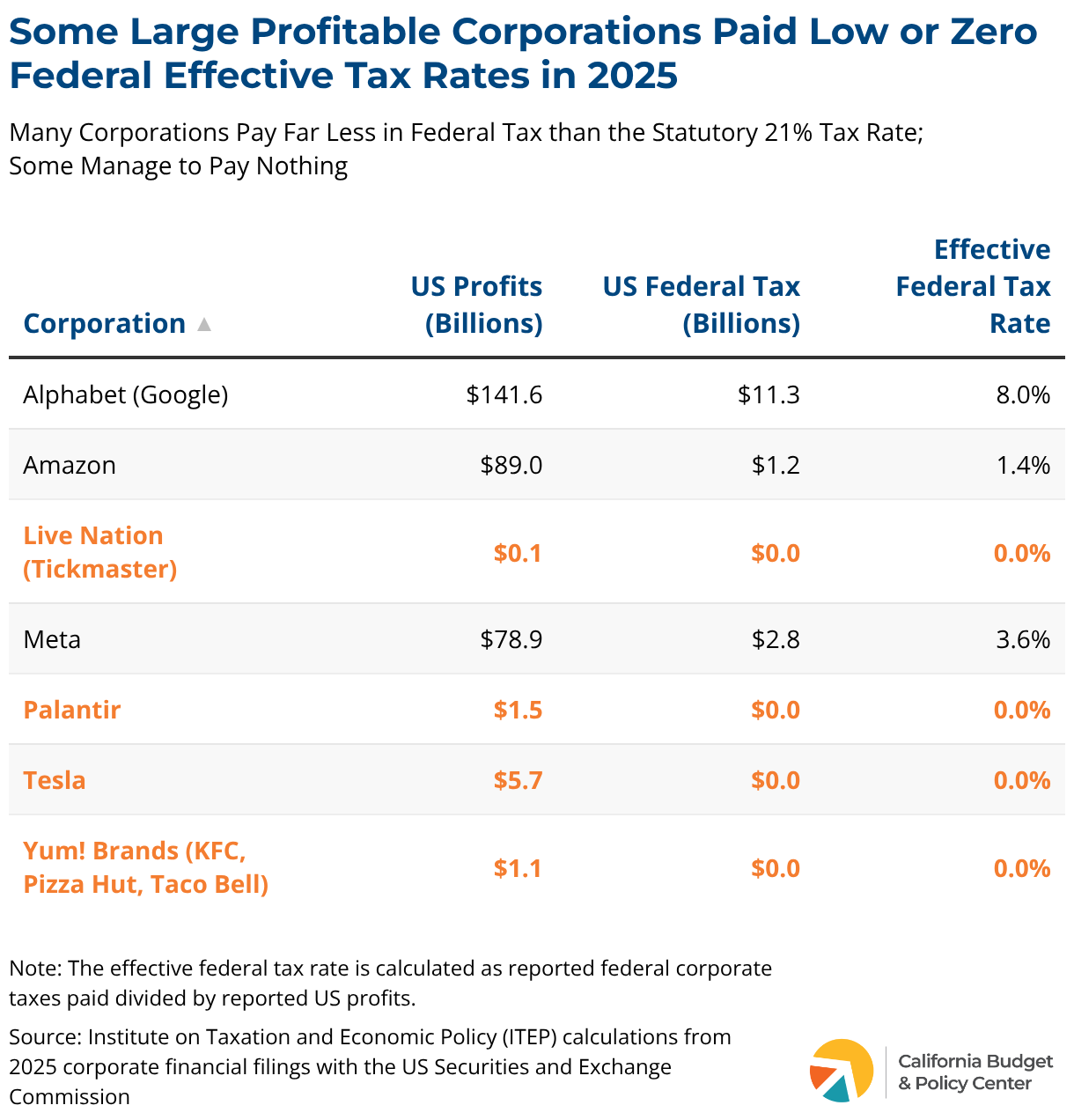 In the wake of H.R. 1, some huge corporations are already reporting that they are paying nothing in federal tax or very low effective tax rates despite soaring profits, at least in part thanks to provisions of the new tax law — including Alphabet (parent company of Google), Amazon, Live Nation (parent company of Ticketmaster), Meta, Palantir, Tesla, and Yum! Brands (parent company of Kentucky Fried Chicken, Pizza Hut, and Taco Bell).