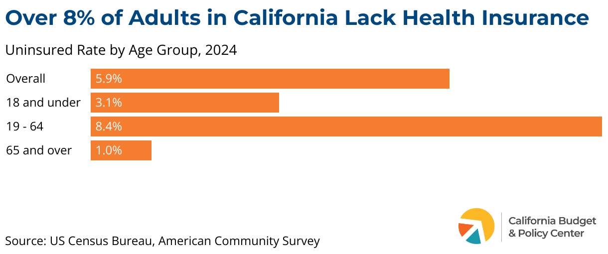 While the overall uninsured rate in California hit a historic low in 2024 of 5.9%, adults ages 19-64 faced a much higher uninsured rate at 8.4%. Many adults work in low-wage jobs that do not offer employer-sponsored health coverage and even when coverage is available, the cost of insurance is often too high, according to research from the Kaiser Family Foundation. In addition, some adults also do not qualify for Medi-Cal or financial help through Covered California. As a result, many working-age adults are left without affordable health coverage. Meanwhile, the uninsured rate for older adults over 65 is much lower than the overall rate. This is largely due to the accessibility of Medicare, which provides health coverage for older adults and people with disabilities.