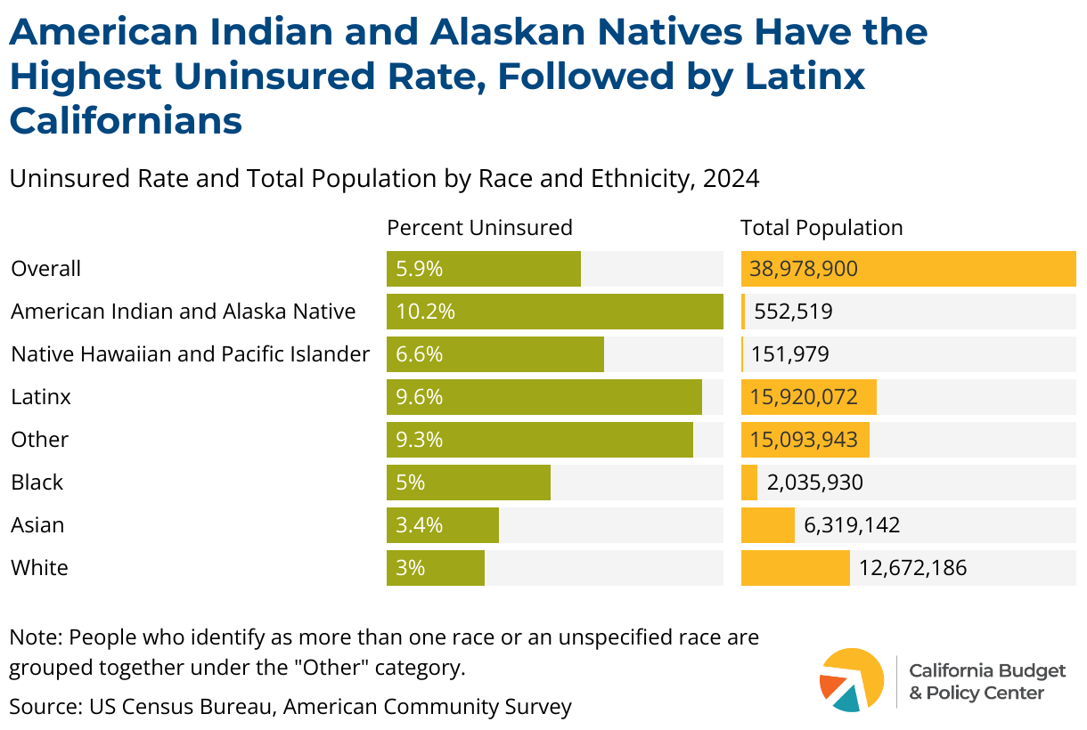 Despite the historic progress made in lowering the overall uninsured rate, significant racial disparities persist in California. American Indian and Alaska Native Californians faced the highest uninsured rate among all racial and ethnic groups in the state in 2024 at 10.2%, and they also faced the highest uninsured rate in 2023. These racial disparities in health coverage highlight the profound and enduring impact of racist policies and practices, which block Californians of color from equal access to health care. Addressing the racial disparities in health coverage requires targeted outreach and education efforts along with other antiracist policy actions to improve health and well-being for Californians of color.