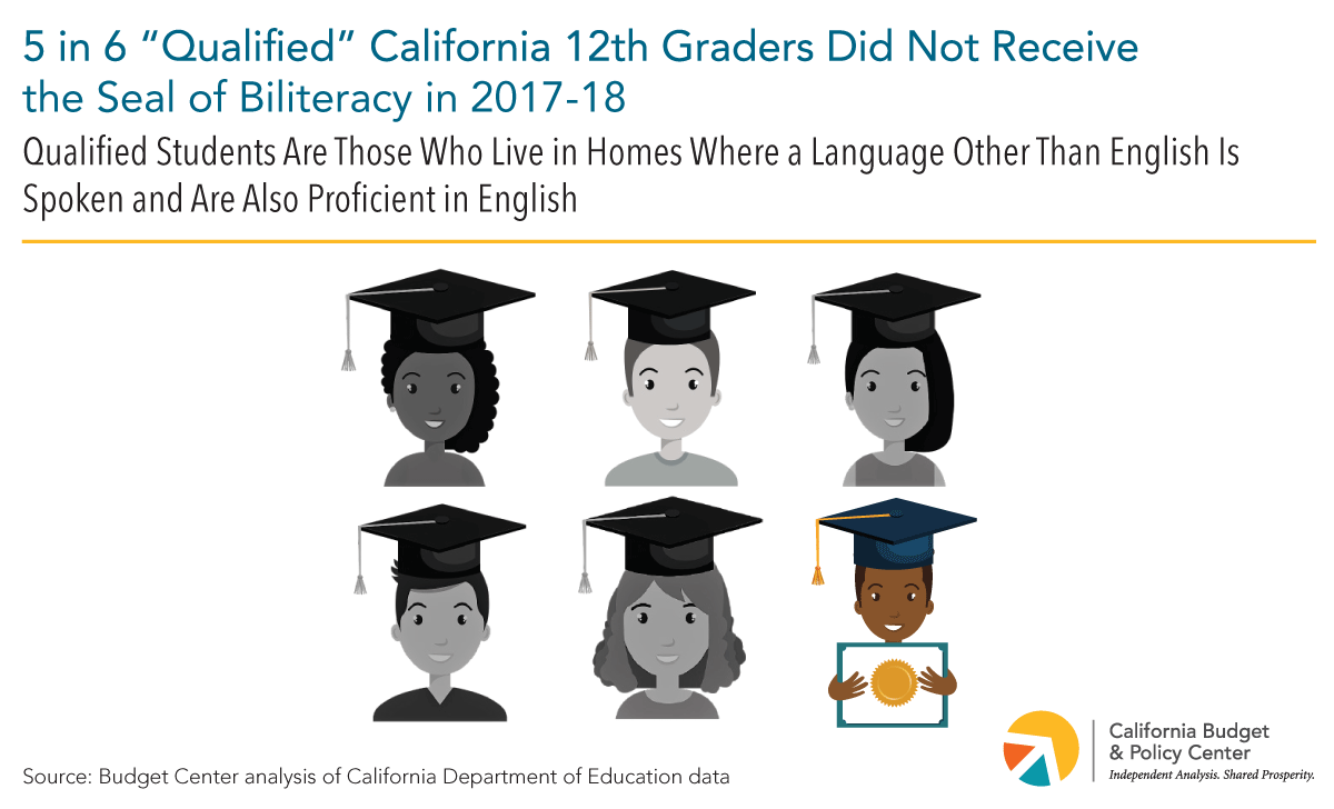 Relatively few California students who live in homes where a language other than English is spoken receive the Seal of Biliteracy, despite the language assets they bring to the state’s classrooms. Any student who does not become biliterate represents a missed opportunity. But, this is especially true for students who live in homes where a language other than English is spoken and are also proficient in English: Five in six — more than 146,000 — of these “qualified” 12th grade students did not receive the Seal of Biliteracy in 2017-18.