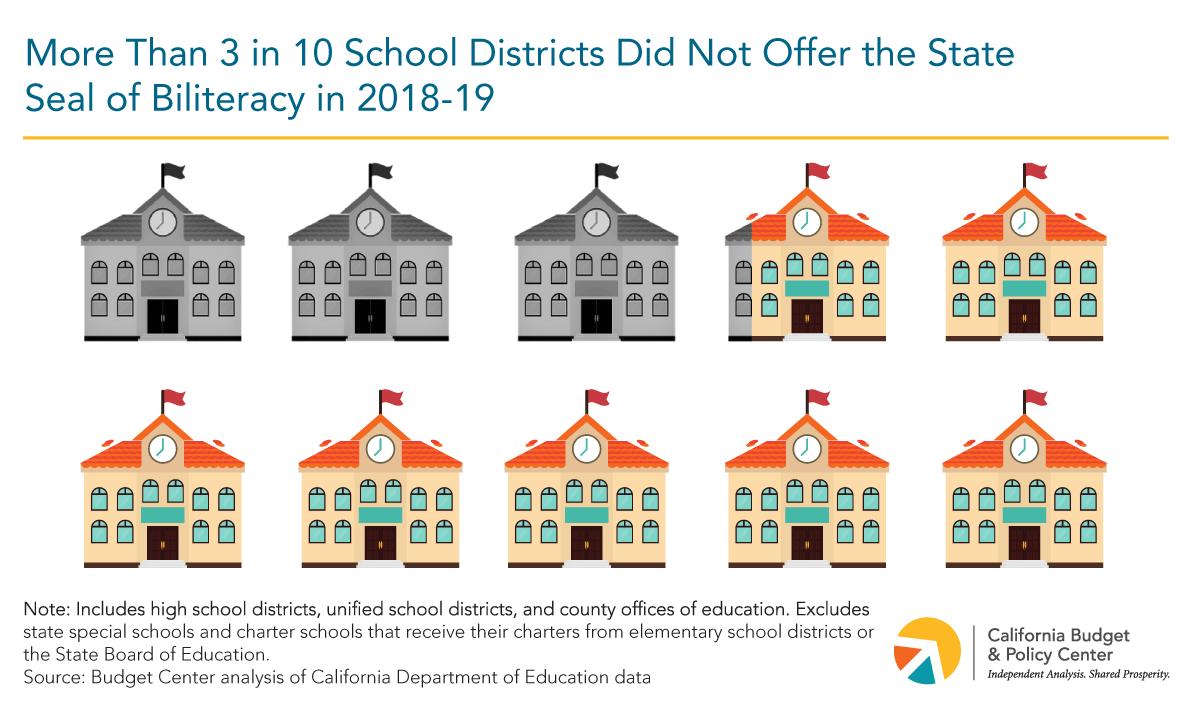To encourage biliteracy and recognize students’ language skills, California established the State Seal of Biliteracy program in 2012. Any school district, county office of education, or charter school can offer the Seal of Biliteracy to high school graduates who achieve a high level of literacy and fluency in English and at least one other language. The State Seal of Biliteracy is free, voluntary, and schools can adopt it using an easy on-line form. However, while a majority of California school districts that issue high school diplomas offered the Seal of Biliteracy to their students in 2018-19, more than 3 in 10 (31.8%) did not.