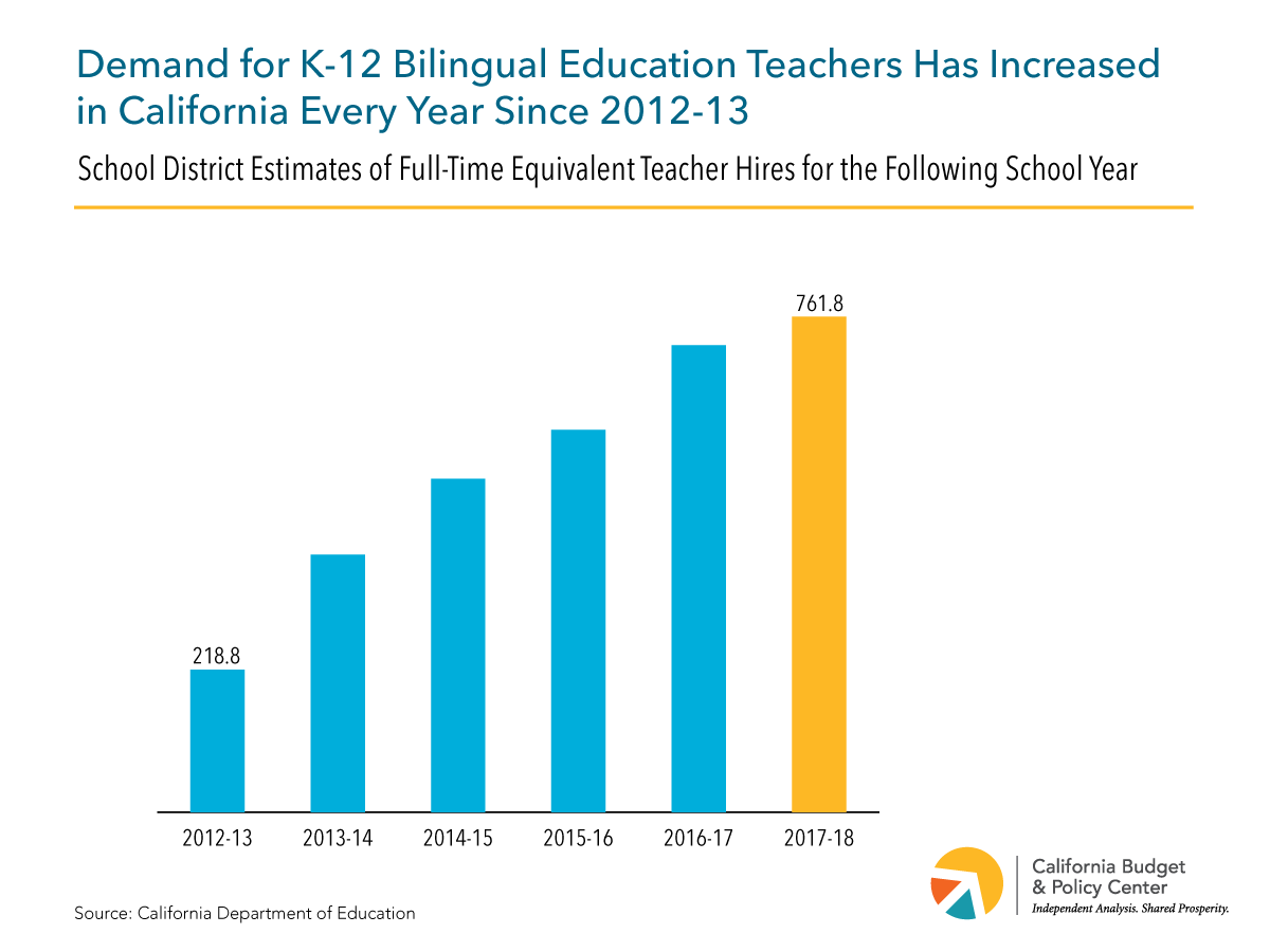 While California has taken some important steps in recent years to help bilingual students achieve biliteracy, the state faces significant challenges in meeting the need for adequately trained bilingual education teachers who can support these students. Voters ended restrictions to bilingual programs by approving Proposition 58 in November 2016. The following year the State Board of Education adopted the California English Learner Roadmap and the Legislature established the Bilingual Teacher Professional Development Program. In that time, the demand for bilingual education teachers has grown — as it has every year since 2012-13 when school districts estimated hiring close to 220 bilingual education teachers. By 2017-18, that number had increased by nearly 250%, to an estimate of roughly 760.