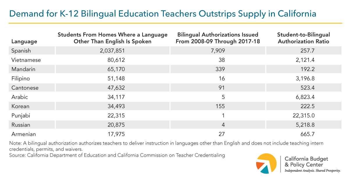 Nearly 2.6 million California K-12 public school students (41.8%) bring a linguistic asset with them to school every day: living in homes where a language other than English is spoken. A majority of these students (1.4 million) demonstrate English proficiency during their school years. But students’ home language skills are often neglected at school and that means many do not receive the state biliteracy designation on their high school diplomas that could benefit students as they apply for higher education and employment opportunities. California can change this trend of overlooking the language assets of its K-12 students by increasing its supply of adequately trained bilingual education teachers who can help students become biliterate. Increasing the number of bilingual education teachers in California’s classrooms would help improve students’ futures and play an important role in meeting the demand for bilingual workers and boosting the state’s competitiveness in an increasingly globalized economy.