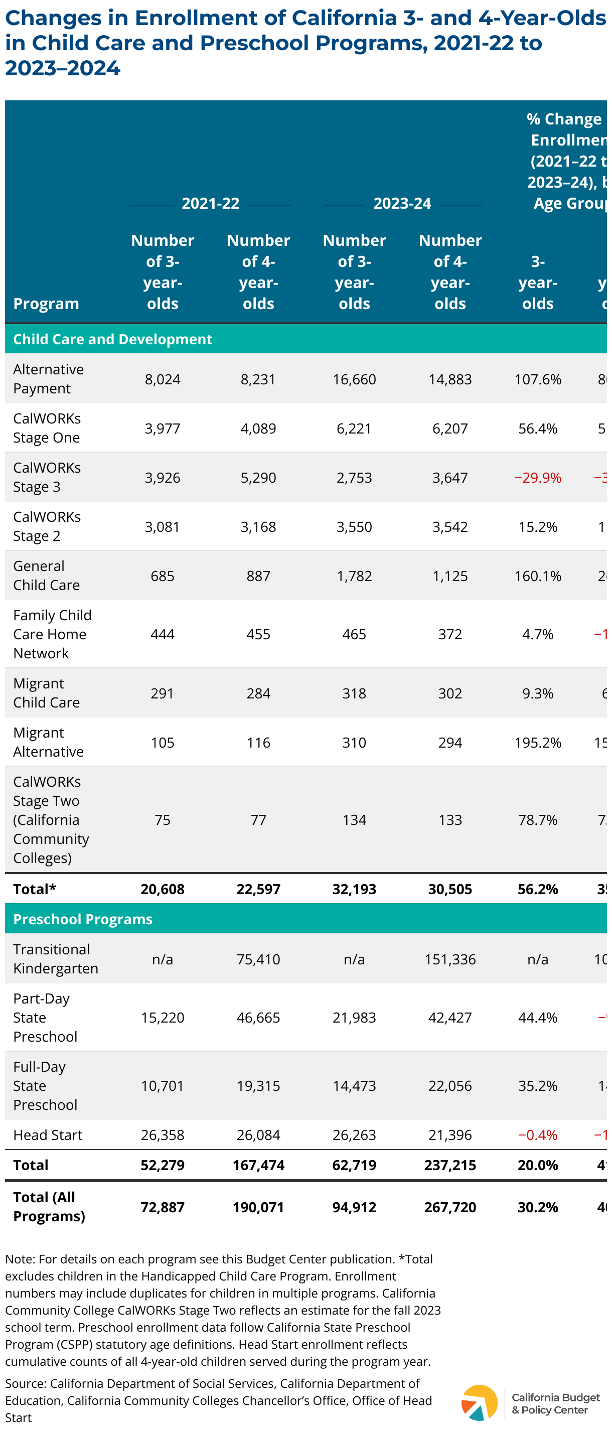 - 4-year-old enrollment grew more slowly than 3-year-old enrollment in most programs. This is especially notable in child care and development programs, where enrollment for 3-year-olds grew by 56% from 2021-22 to 2023-24, possibly reflecting slot expansion in recent years. By contrast, enrollment for 4-year-olds only grew by 35%, with some programs experiencing declines. This slower growth among 4-year-olds may reflect a shift toward Transitional Kindergarten (TK). While growth for 3-year-olds is promising, it still falls short of meeting the need because only 21% of eligible 3-year-olds were served in 2023-24.